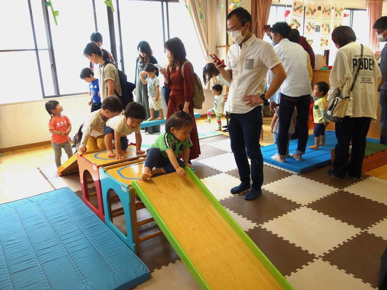 お家の人と一緒に平均台・フラフープ・滑り台などを使った運動遊びでは順番を守り、沢山身体を動かすことができました。