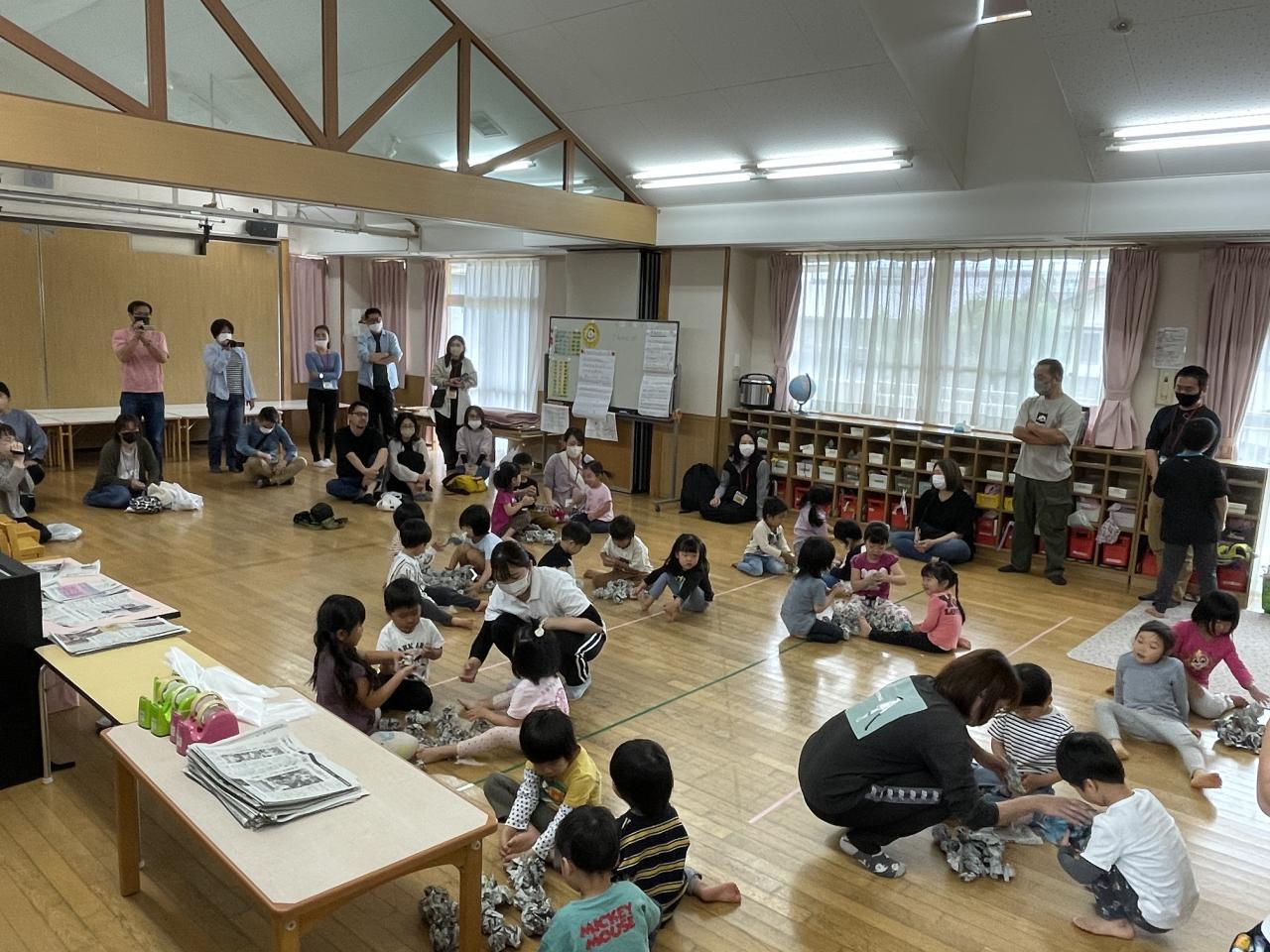 異年齢のトリオチームの友達と新聞を破ったり、丸めたりしてボールを作り、大きくつなげた新聞紙の上に乗せ、合図に合わせてパっと上にあげて「ミニ新聞バルーン」を楽しみましたよ。