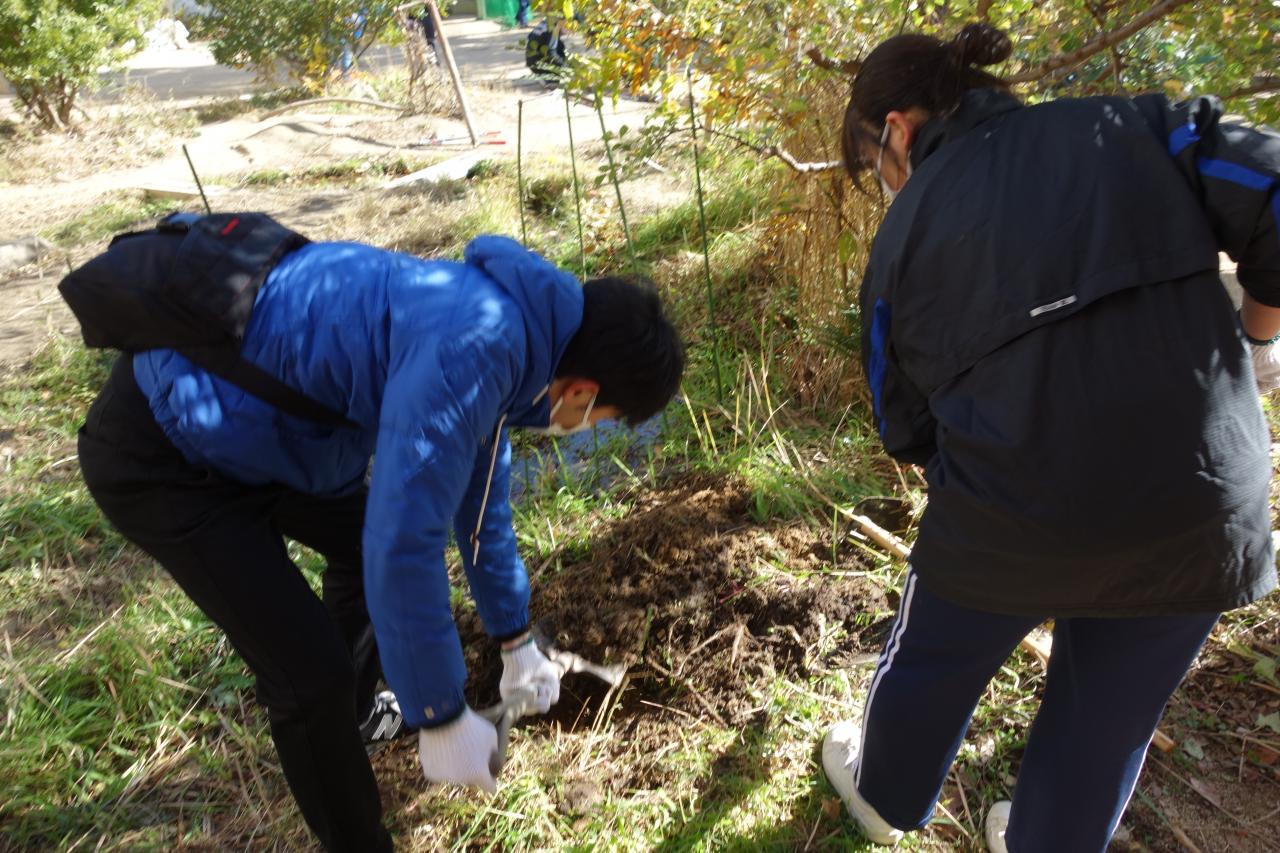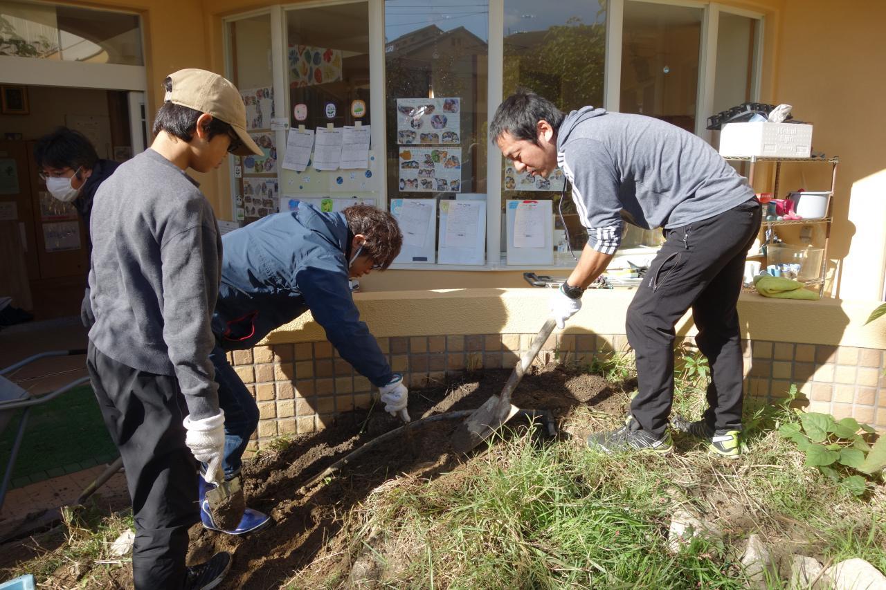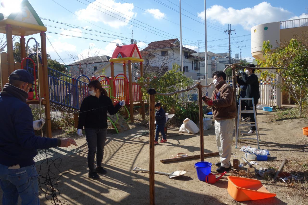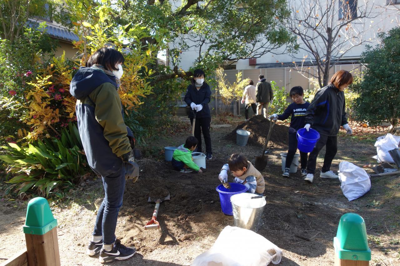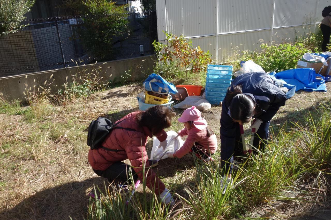 4年ぶりに第9回緑育の会を行いました。在園児、卒園児のご家庭より計28名の方にご参加いただき、園庭と菜園、それぞれのビオトープの整備を行うことができました。