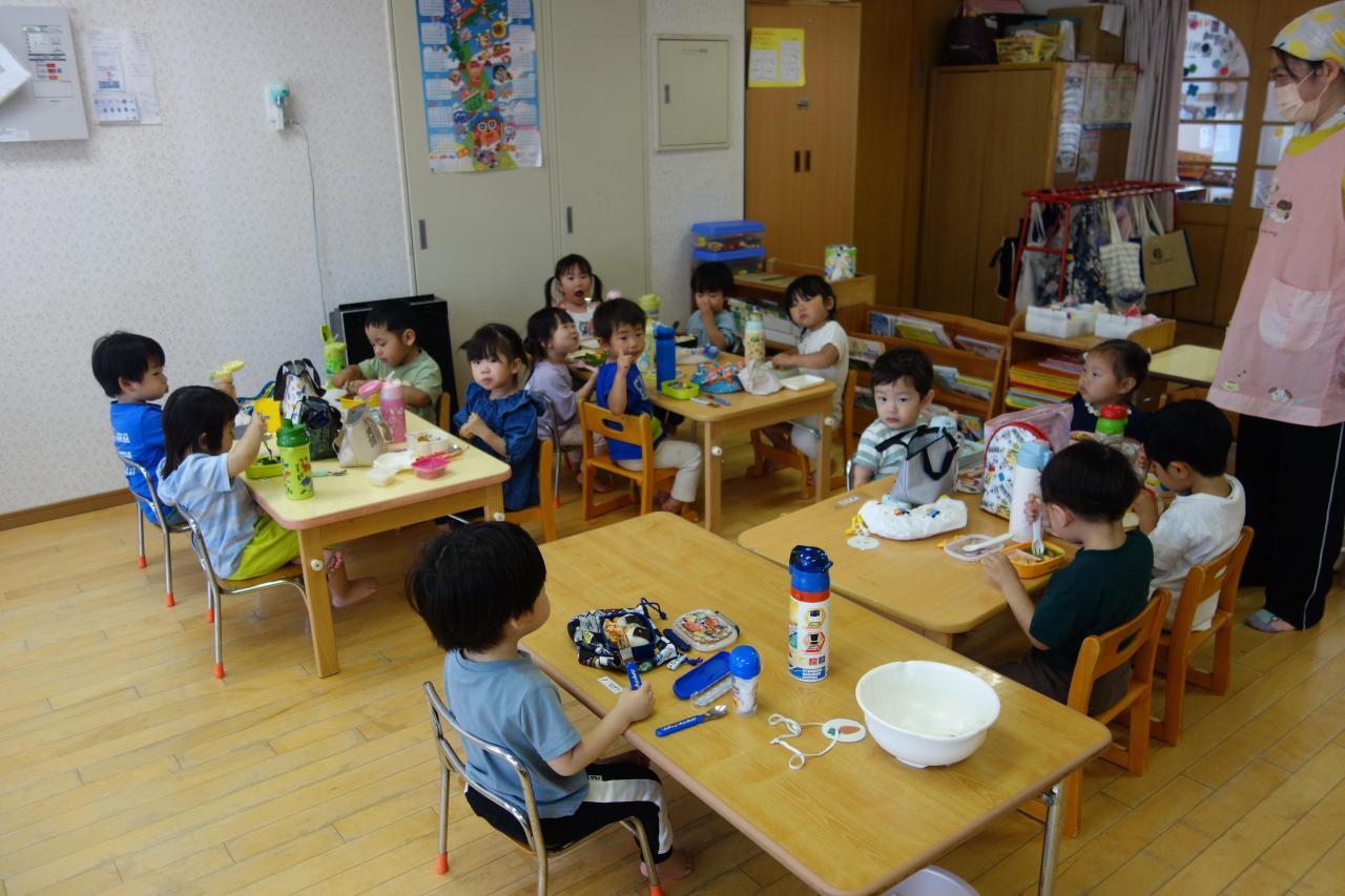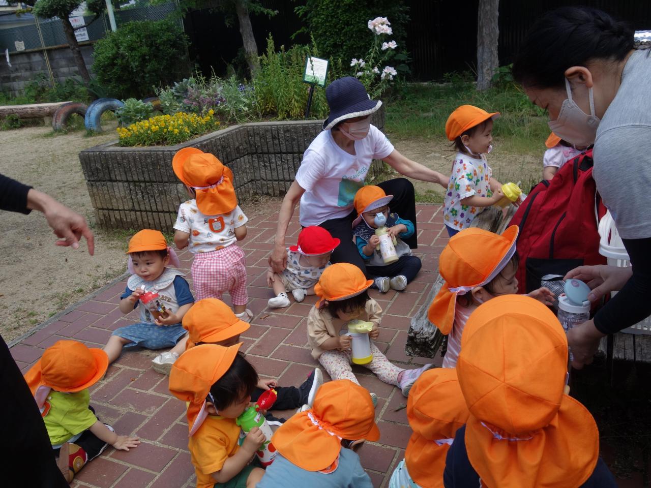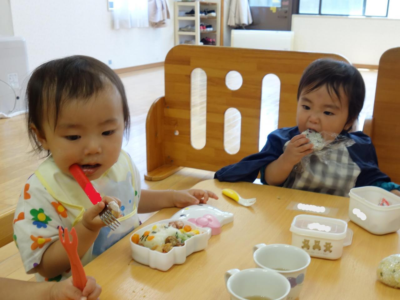 本園までみんなで出かけました。ビオトープの中の池や川をのぞいたり、大型遊具で沢山遊んだりして過ごしました。分園に戻って来てから楽しみにしていたお弁当!「おいしいね」と言いながら,とても楽しくお友達と一緒にいただきました。🍙
