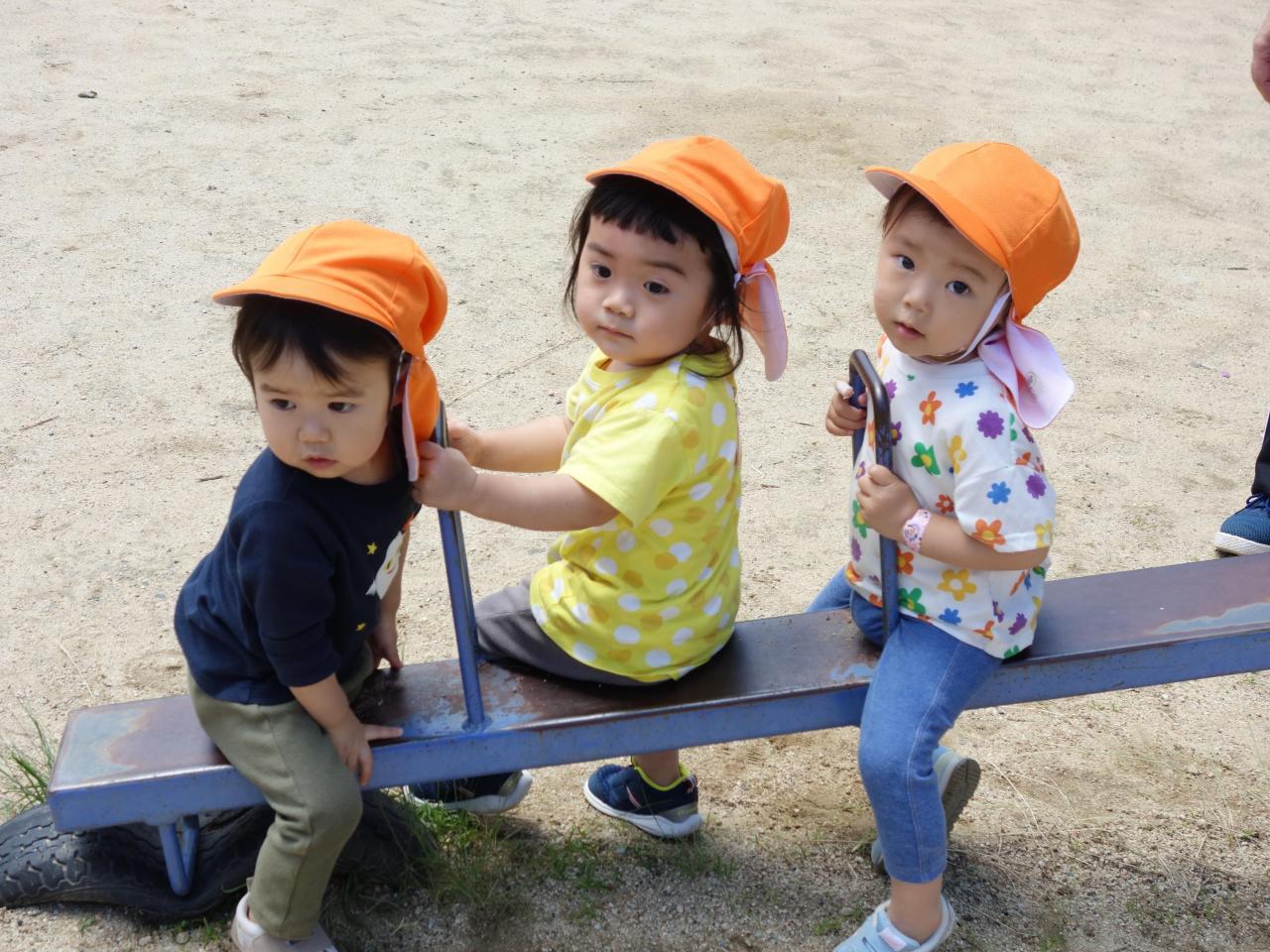 近くの公園に散歩車に乗って出かけました。シーソー、ブランコ、タイヤなど沢山の遊具に目がキラキラ✨していましたよ!好きな遊具を自分で選んで遊ぶ姿もみられ、楽しい時間になりました。