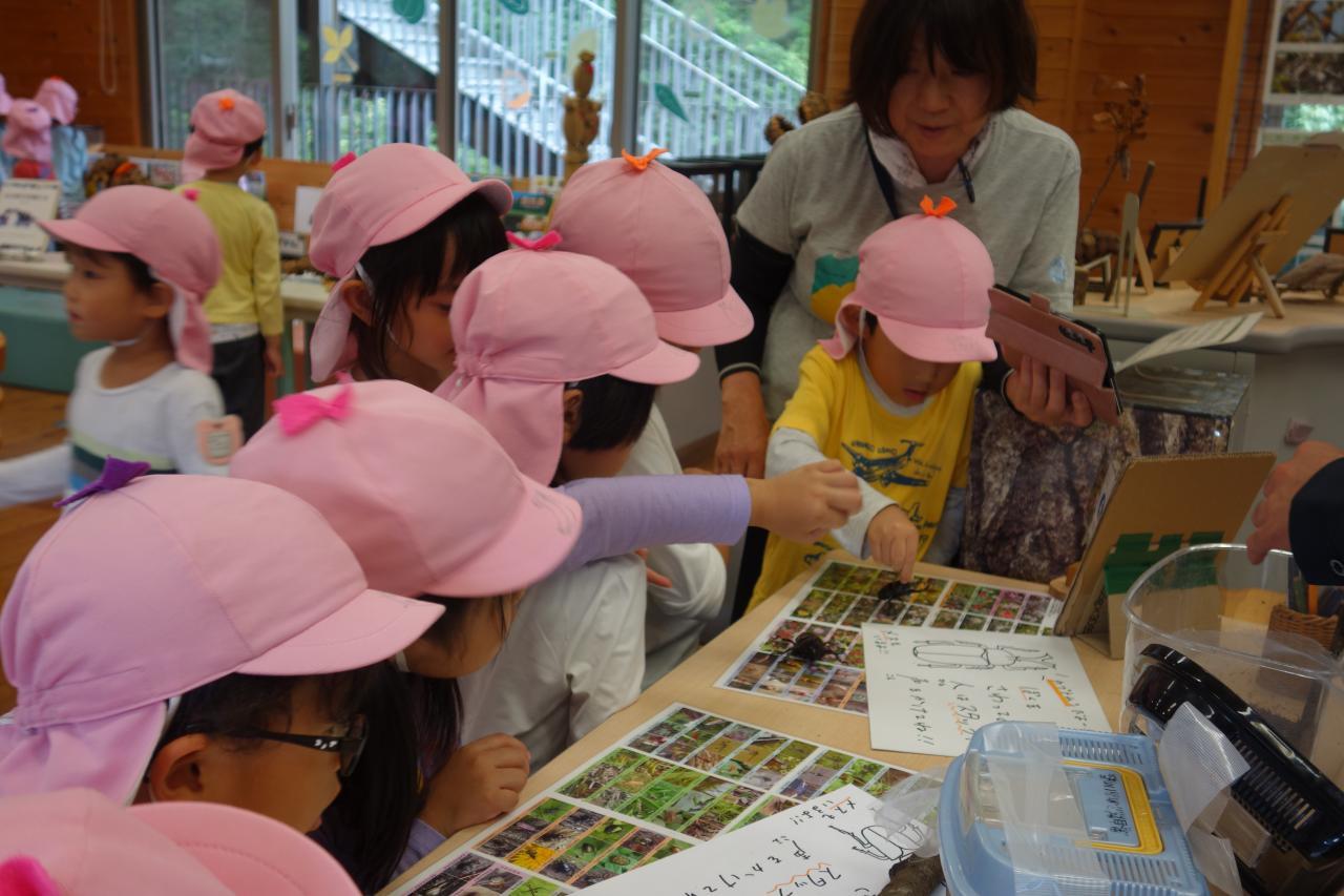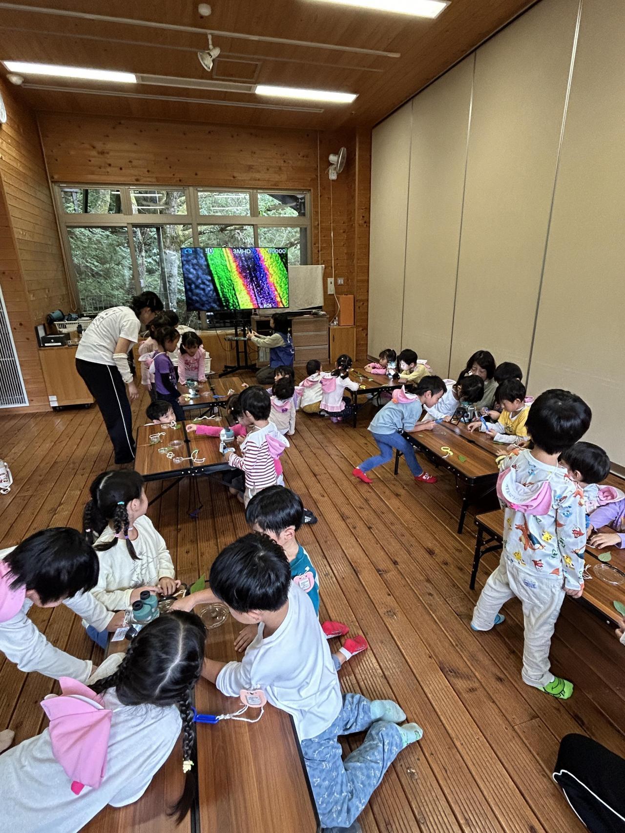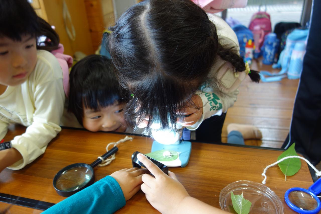 散策の後は森の館に戻り室内活動を行いました。虫メガネや顕微鏡を使ってセミの抜け殻や蝶々やタマムシの羽の観察をしました。みんな研究者のように真面目な顔で覗き込んでいましたよ👀