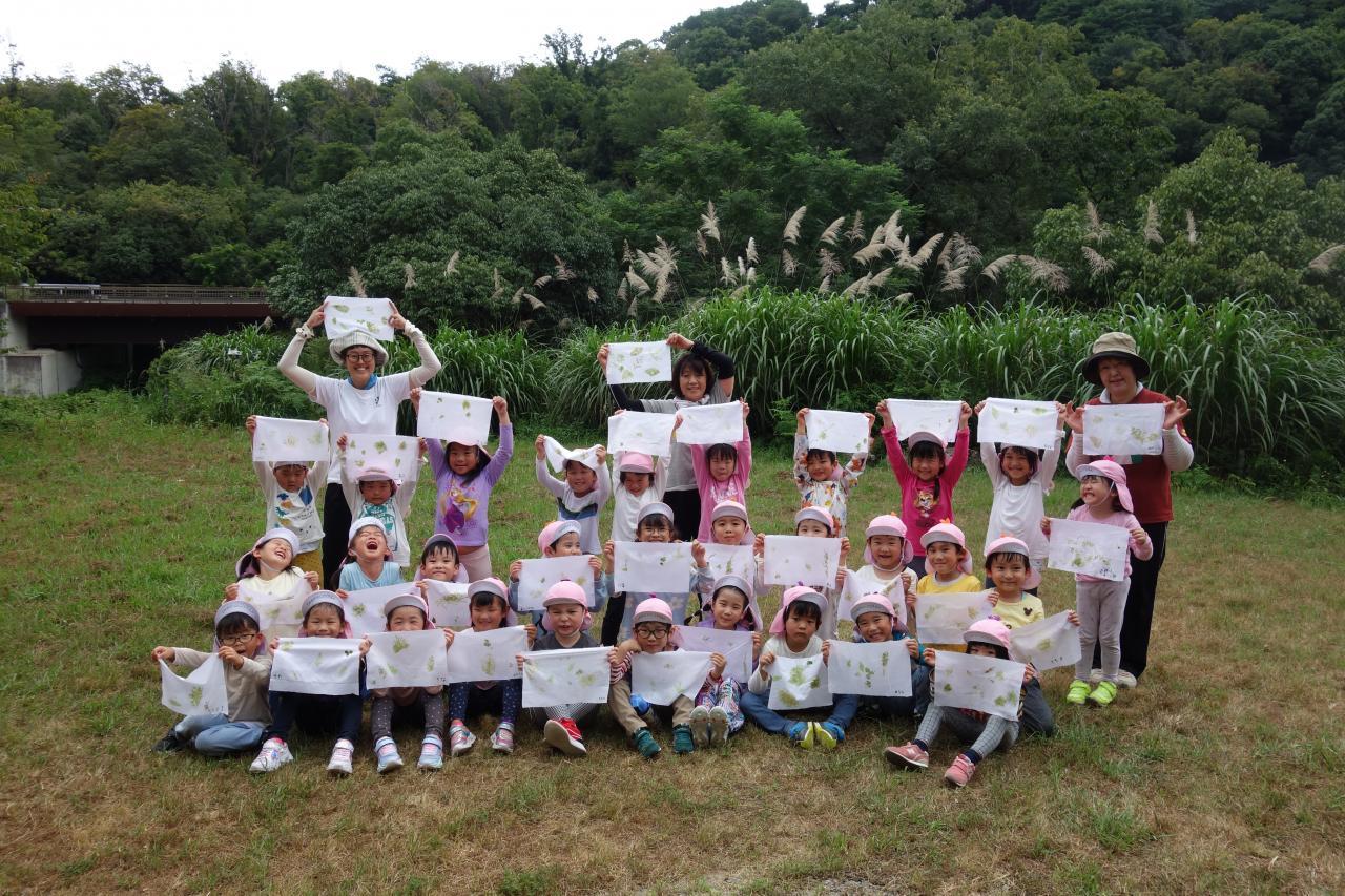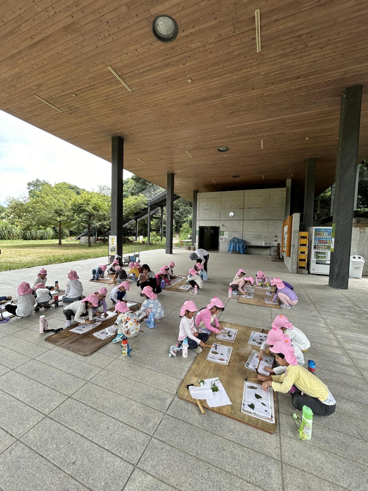 森に住んでいたカブトムシにも触りました。お弁当を食べた後は好きな葉っぱを探して叩き染めを行い「この葉っぱは色がいっぱいついた」「この葉っぱはなんで色がつかないんだろう」と考えながら一生懸命トントン金づちでたたいていました。素敵な葉っぱの染めものができると、友達同士で見せ合いっこをして喜んでいましたよ🤩