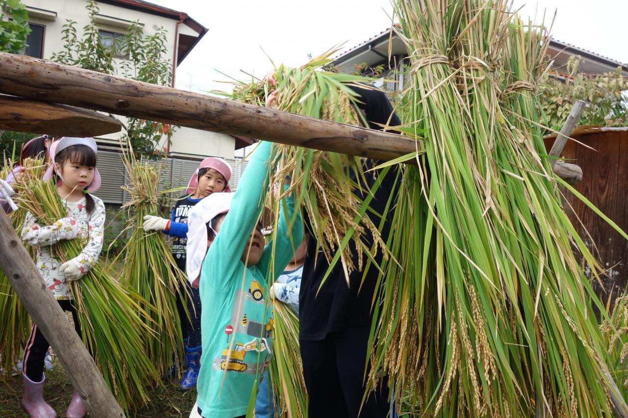 刈った稲をはざ棒にかけました。お米が甘くなるように下向きにかけますよ。