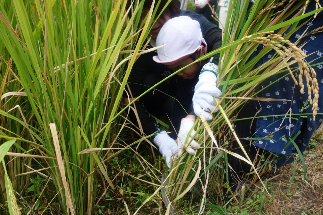 カマを持って稲を刈るよ!ザクッザクッといい音です。