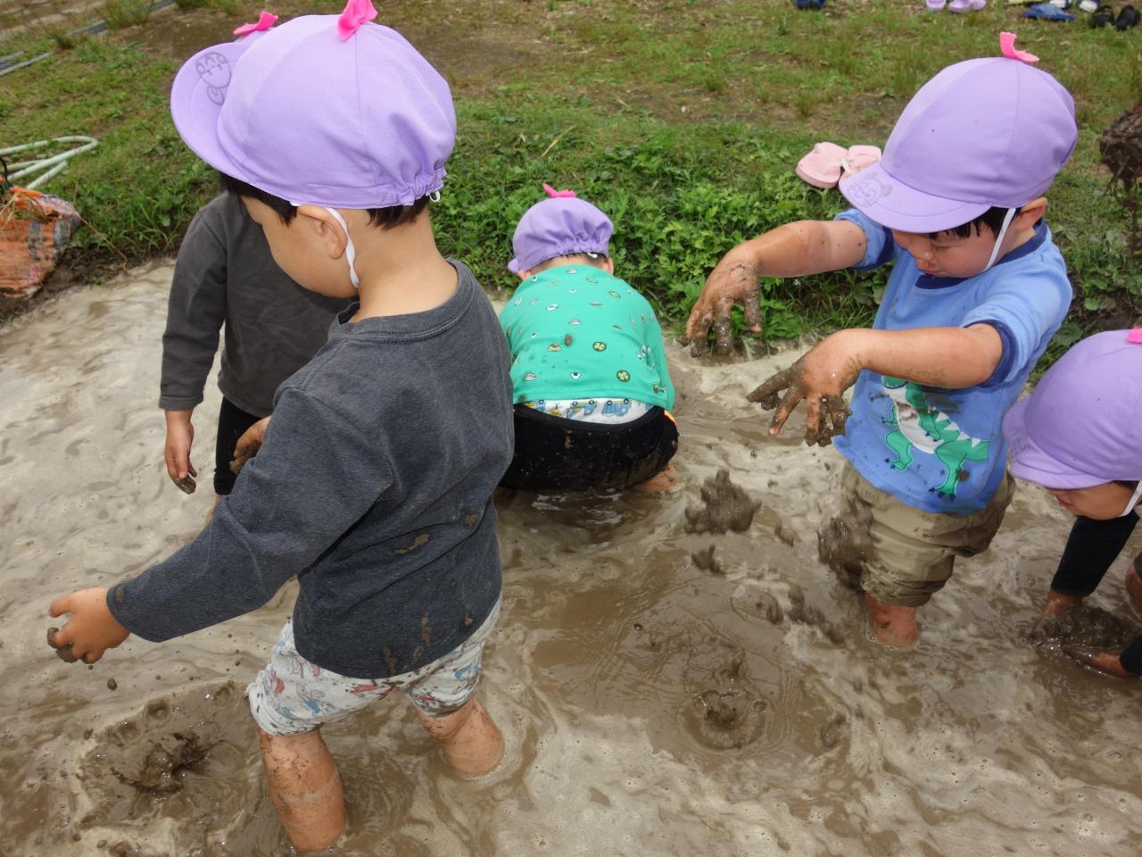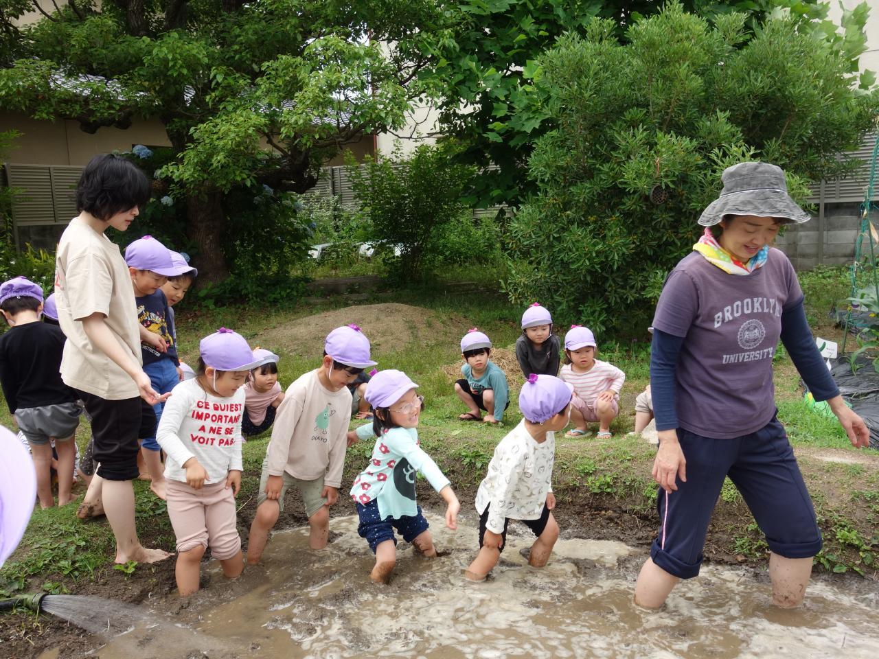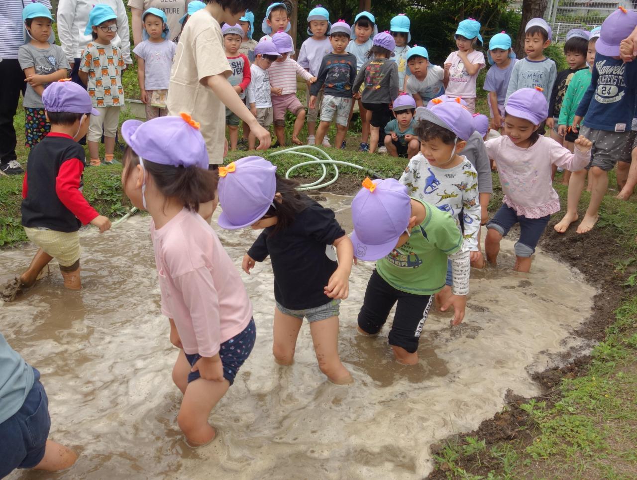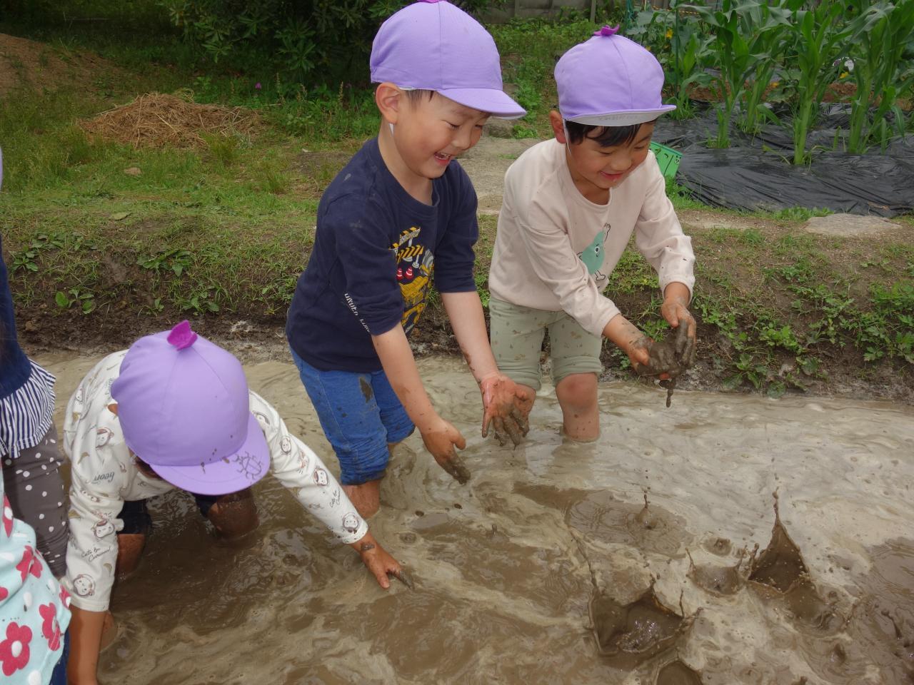 5歳児クラスの田植え🌾に向けて、土慣らしも兼ね、毎年4歳児クラスが泥んこ遊びを行います。今年もダイナミックに泥の中に入り、歩いたり、触れたり、手を突っ込んだりしながら楽しんでいました。どんな感じ??と尋ねると「きもちいい」「あったかい」「ぬるぬるするー」という声が返ってきましたよ。途中、昨年泥んこ遊びを行った5歳児クラスの子どもたちが見学に来て「きりん組の時にやったで」と懐かしんでいました。また、「次は田植えやな」と次の田植えに期待をする様子もありました。こういった自然体験が、子どもたちの良い思い出になるといいなぁと思います。