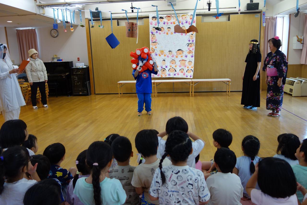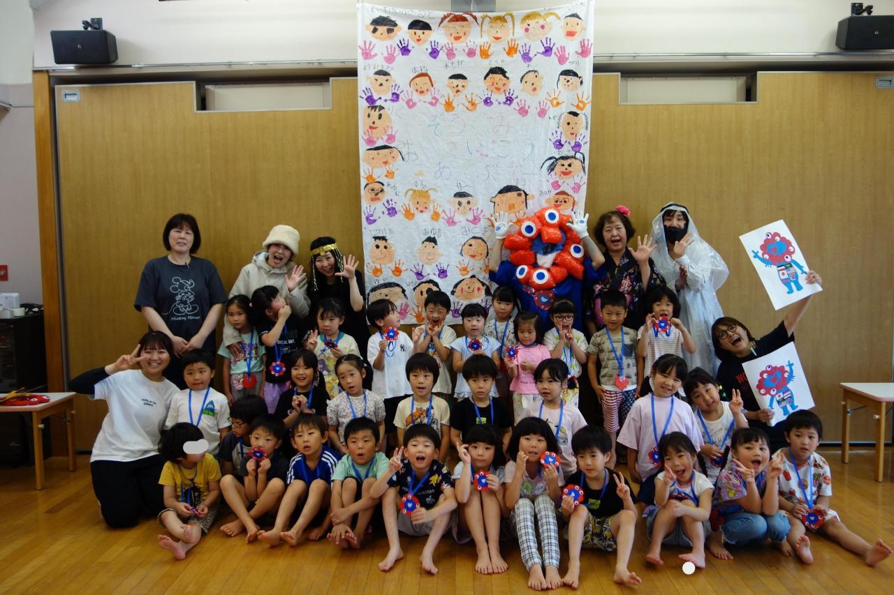 子どもたちがとても楽しみにしていた「ぞうぐみ さいこう あそぶでー」が良いお天気の中、開催されました。今年度から今まで「わくわくデイキャンプ」という名称で行ってきましたが、子どもたちが名称を自由に考えるのも良いねとなり変更しましたよ。大阪・関西万博で有名なミャクミャクのお友達「みゃこみゃこ」や世界の国からお客様も遊びに来てくれ、とにし万博を楽しみました。朝から夕方まで、子どもたちも保育者も笑顔にあふれ、楽しそうであっという間に時間が過ぎましたよ。