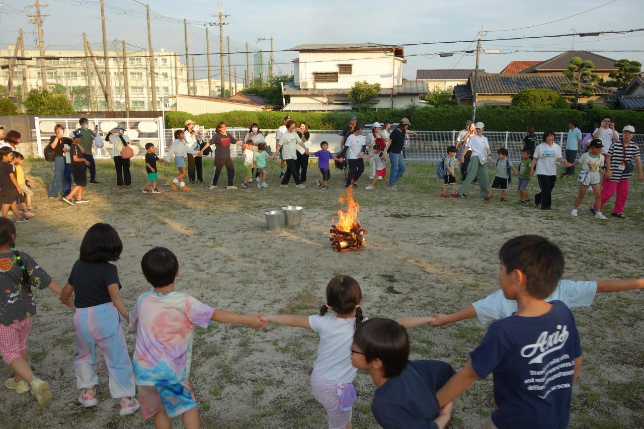 1日のおわりはキャンプファイヤー。「あそびのにわ」で家族の人と一緒に「マイムマイム」を踊りました。ぞう組での思い出がまた1つ増えましたね🤩