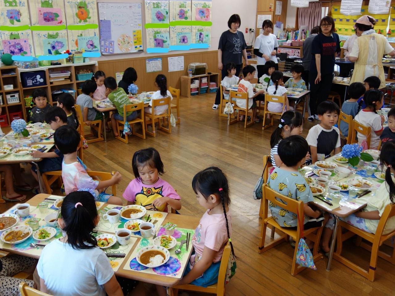 きりん組の時に栽培した、ジャガイモとたまねぎを使ったカレーライスを「感謝をこめていただきます」年下のお友達からプレゼントでお花とランチョンマットをもらいましたよ。