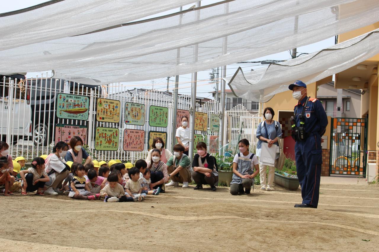 東消防署より消防士さん4名が来られ、火災の時の避難の仕方や初期消火の方法を教えて頂きました。子ども達は憧れの消防自動車を間近で見学でき、大喜びでした。最後はお礼を伝え、手を振って消防車を見送りました。その後、3,4,5歳児は遊戯室で『ニャン太のお誕生日は火事さわぎ』のDVDを鑑賞し、火事の恐ろしさや避難の方法を再確認しました。
