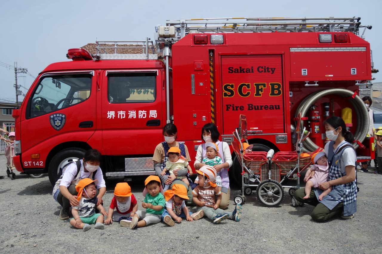 訓練が終了すると、子ども達待望の消防車見学。4,5歳児は、不思議に思う事などを積極的に消防士さんに質問し、関心の高さを感じました。丁寧に答えて頂き、子ども達は大満足の様子。消防車の前で記念撮影をしました。