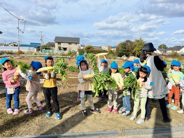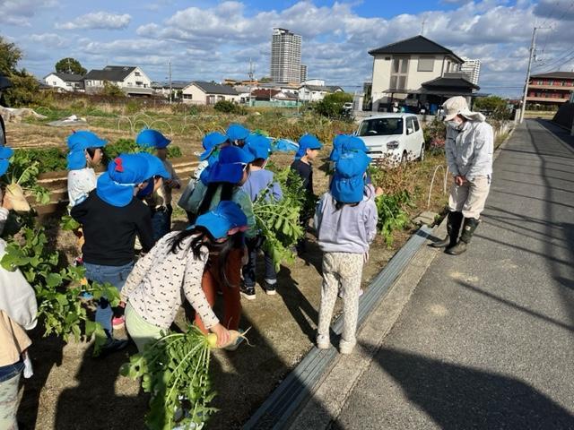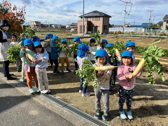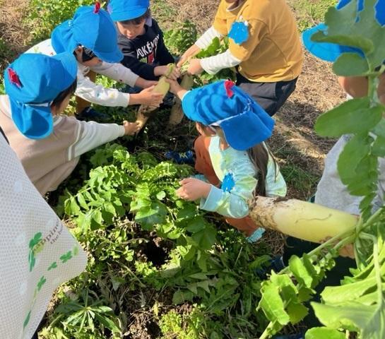 近隣の畑の方から「大根が育ったので、採りにきませんか?」とお声掛け頂き、5歳児ひまわり組が収穫に出かけました。