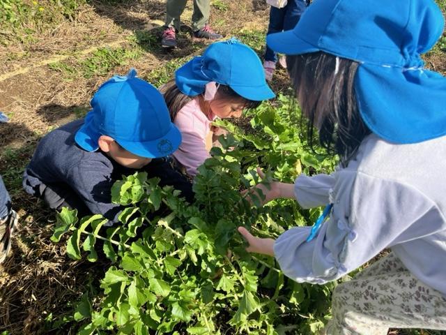 大根の畑には立派な大根の葉が青々と茂り、子ども達はその葉の下を覗き込んで「どの大根がいいかな」と熱心に選び、抜く大根を決めていました。