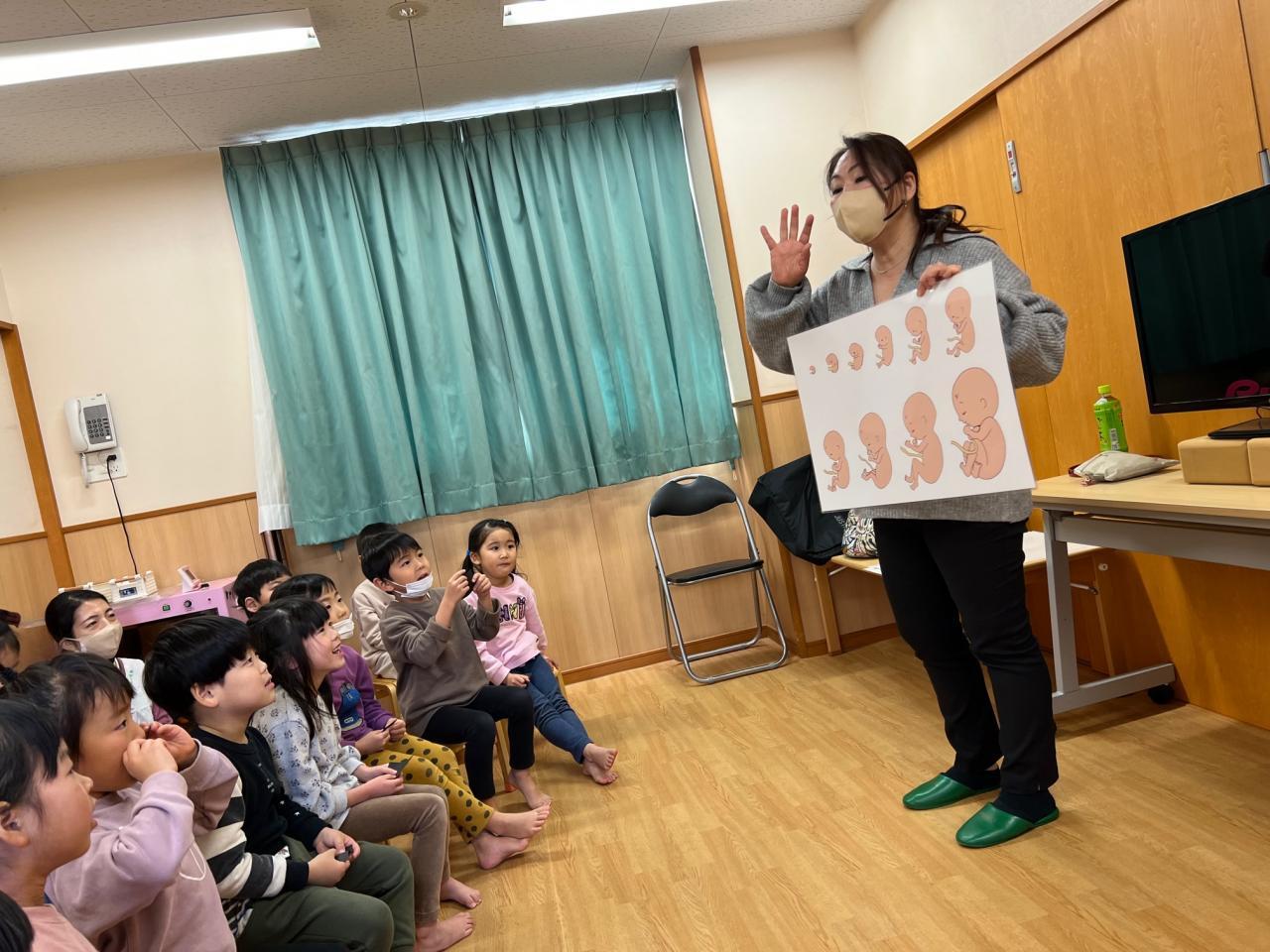 「命の始まり~誕生、体のプライベートゾーン」について、助産師 近藤陽子氏に5歳児を対象に話していただきました。始まったばかりの命は、針で穴をあけた程の大きさで、そこからどのくらいの時間をかけて大きくなり、どんな風にして生まれてくるのかを知ったり、一人一人の命の大切さ、自分自身の体のプライベートゾーンは見られても触られてもいけないことなど、教えていただきました。