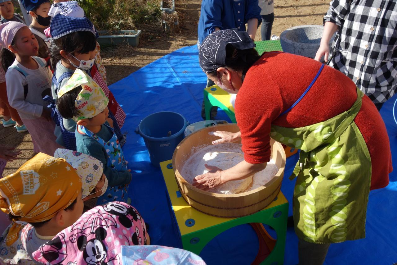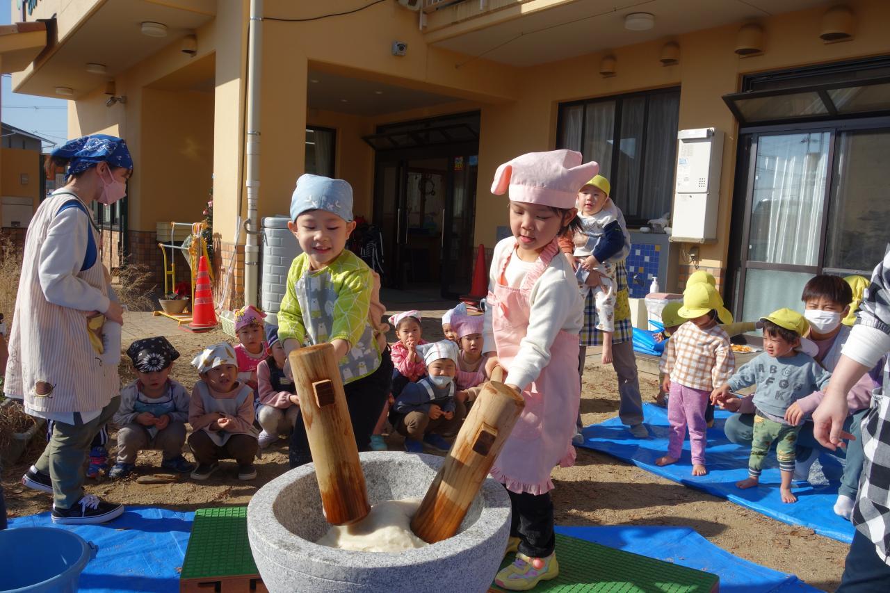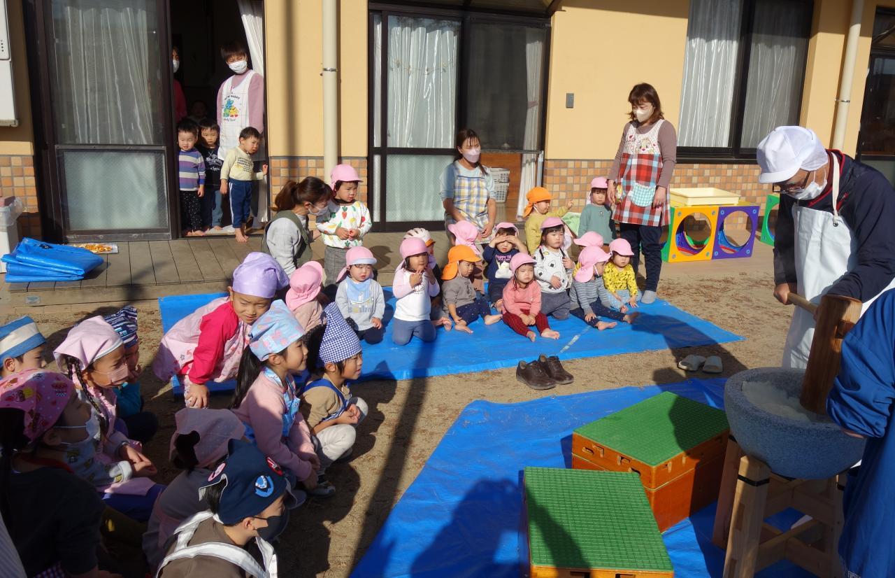12月9日(金)晴天のもと、園庭で3年ぶりのもちつきを行いました。