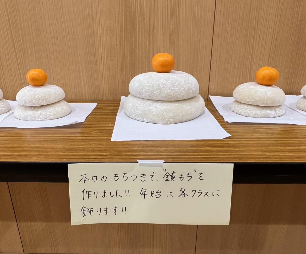 前日にもちつきの会を行い、そこで『もちつきの由来・お餅の話』を聞いていた子ども達は、より一層楽しみにしていたようです。今回は、4,5歳児がもちつきをして、0~3歳児はその様子を見学しました。蒸したてのおこわから漂う匂いに「うわー、いい匂い。もう美味しそう!」、どんどんと粘り気を増しながらまとまっていく様子に「すごい!どんどんお餅になっていくー」と次々に感想を話しながら見ていました。出来上がった餅は、今回は残念ですが食べることを控え、職員が片栗粉をまぶしながら形を整えて鏡餅に仕立てました。新年に玄関や各クラス保育室に飾りたいと思います。