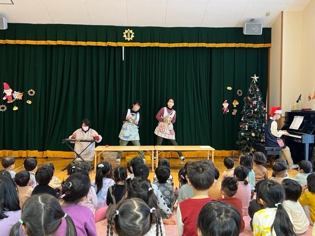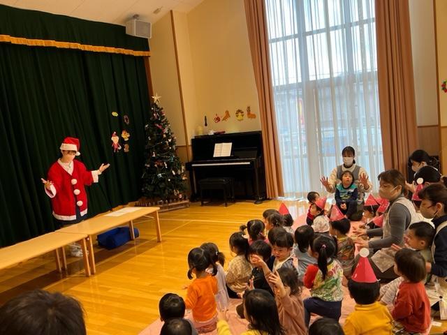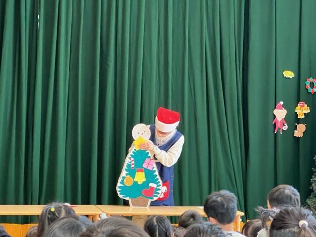 子ども達が心待ちにしているクリスマス。こども園では、一足早く22日にクリスマス会を行いました。保育者によるクリスマスソングの合奏や雪だるまさんのツリーに飾り付けていくお話をペープサートで観たりしました。
