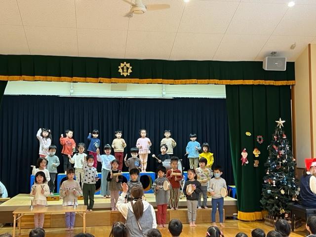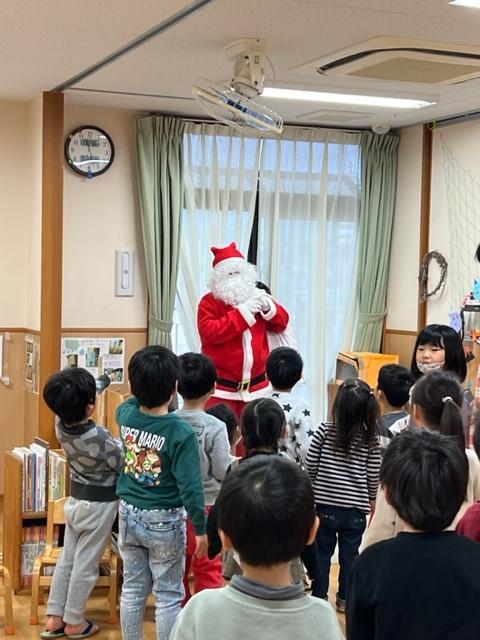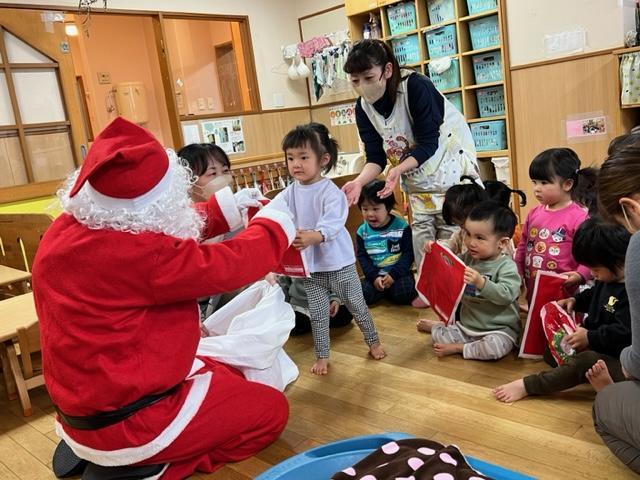 3~5歳児は、先日のわくわく音楽会で披露した合奏を演奏しました。会を楽しんだ後、保育室に戻って過ごしていると・・・どこからか鈴の音が聞こえて、その音が近づいてきた!と思った瞬間、窓の外に大きな袋を背負ったサンタクロースの姿が見えました。驚きのあまり泣いてしまう子もいましたが、少しずつ慣れて、『ありがとう!』と伝えながらプレゼントを受け取っていました。プレゼントの中を見るのは帰ってからのお楽しみね!と大事に抱えていました。