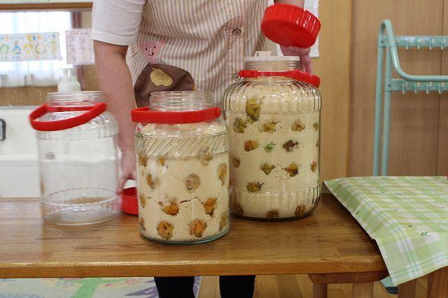 梅と砂糖を入れる工程を"どうしたら全員が参加できるか”とグループ毎に話し合い"並んで一人ずつ順番にしよう”と決めました。『梅、砂糖、梅、砂糖』と言いながら、容器の底から丁寧に埋めていきましたよ。
