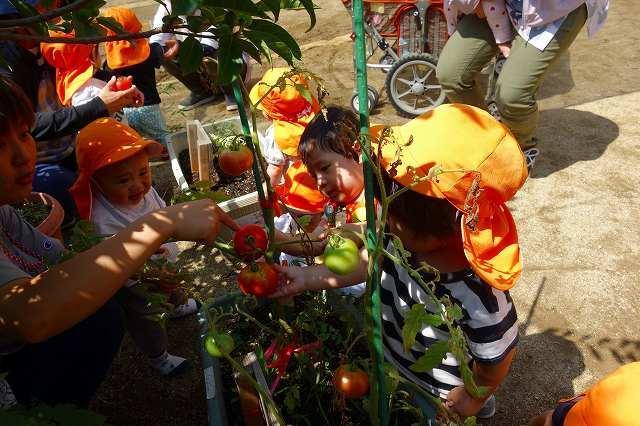 水やりをして生長の観察を続けてきた「トマト」が大きくなり、"赤いトマト”を選んで収穫しました。昼食で出してもらうと美味しそうに食べていましたよ。