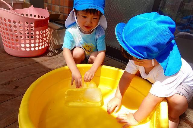 氷を触って冷たい感触を味わいました。ツルツルとした氷を大事に持ち、氷同士を重ねてみたり、段々と溶けて小さくなっていく様子を不思議そうに観察したりしました。