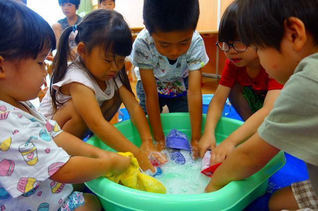 自分の帽子や人形の服を洗濯しました。泡立つ石鹸の感触を楽しみながら、きれいになっていく事の楽しさを感じました。『どこに干したら乾くかな?』と太陽の光が当たる場所を探し、すっきりと乾く心地よさも感じられたようです。