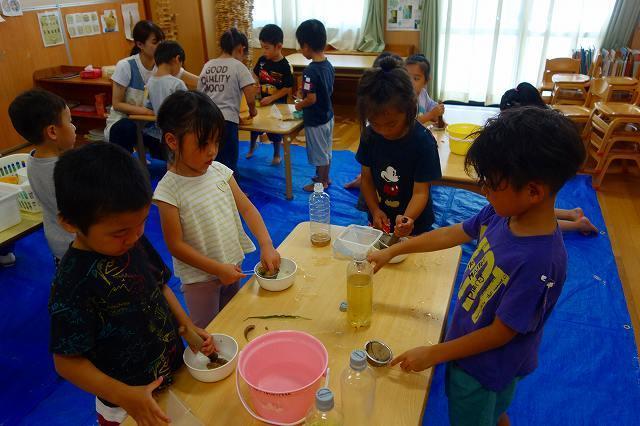 園庭で見つけた葉や草を使って色水を作りました。すりこ木や茶こしの使い方を知らせ合いながら器用に使い、その色が付いた水に変わると友達と見せ合ったり、ジュースに見立てたりし『今度はどんな色になるかな?』と何度もチャレンジしていましたよ。