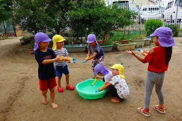 水てっぽうで遊びました。"どうすれば容器にたくさん水を吸い上げられるか”また"どの方向に水てっぽうを向けたら遠くへ飛ばせるか”と試行錯誤しながら友達同士で伝え合っていました。最後には全身ずぶ濡れになりながらも笑顔が輝いていました。