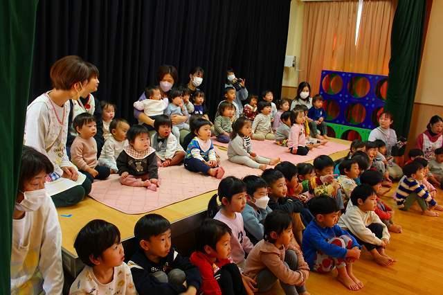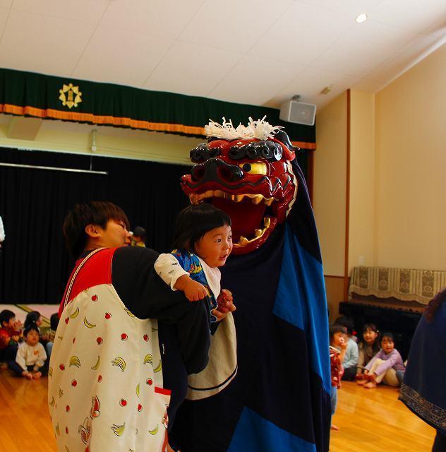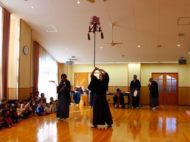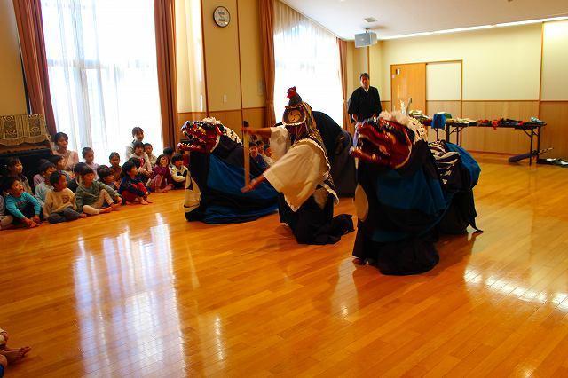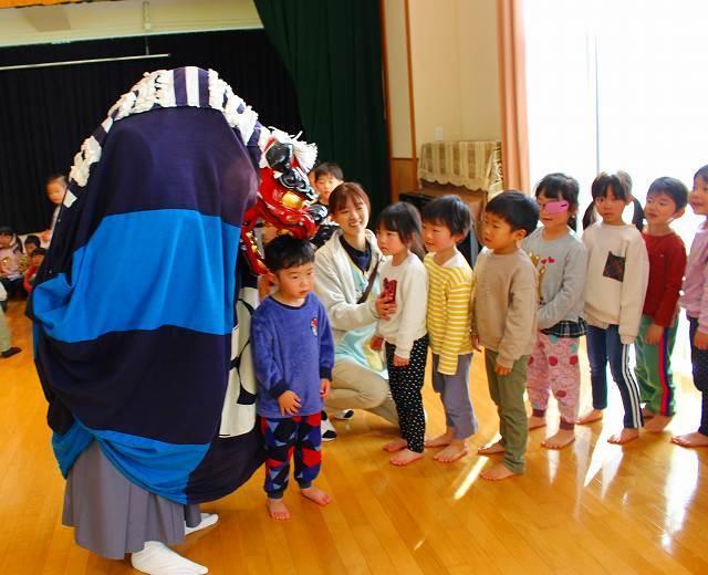 江戸時代から続く伝統芸、国の重要無形民俗文化財である『伊勢大神楽』を今年も見せて頂きました。‟無病息災”‟家内安全”を祈願し、悪事のお祓いの意味が込められた‟獅子舞”や‟皿回し”等の曲芸が目の前で繰り広げられました。今年は久しぶりに全クラス・ファミリーが遊戯室に集まり、4家庭の保護者やご兄弟の方々も観覧にいらっしゃいました。