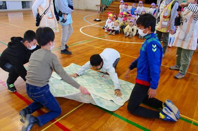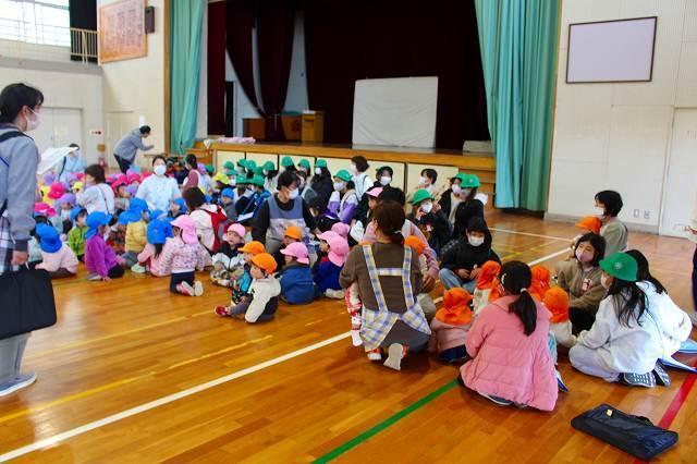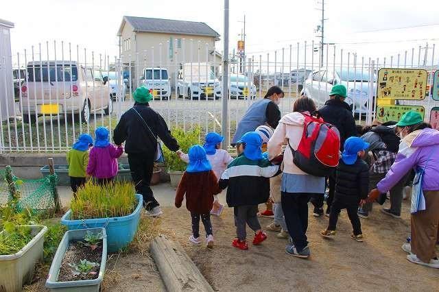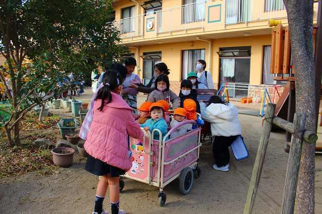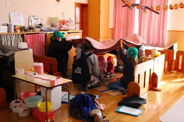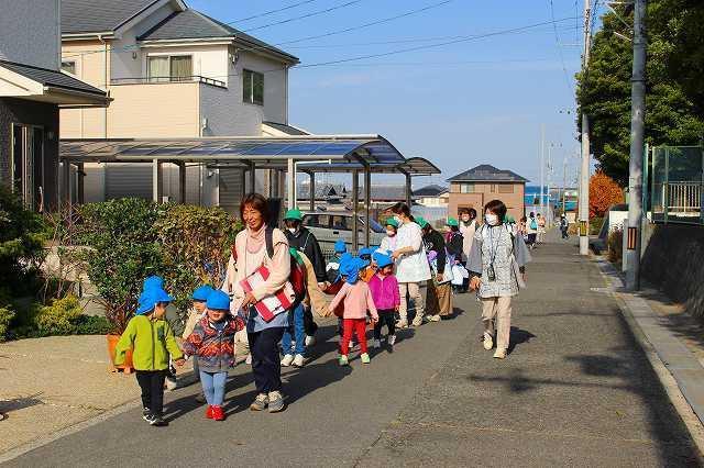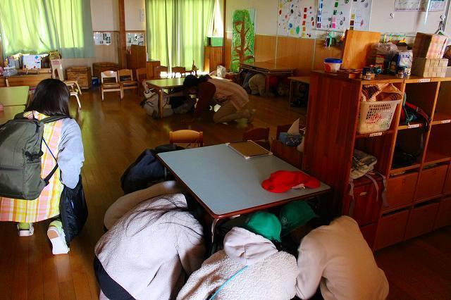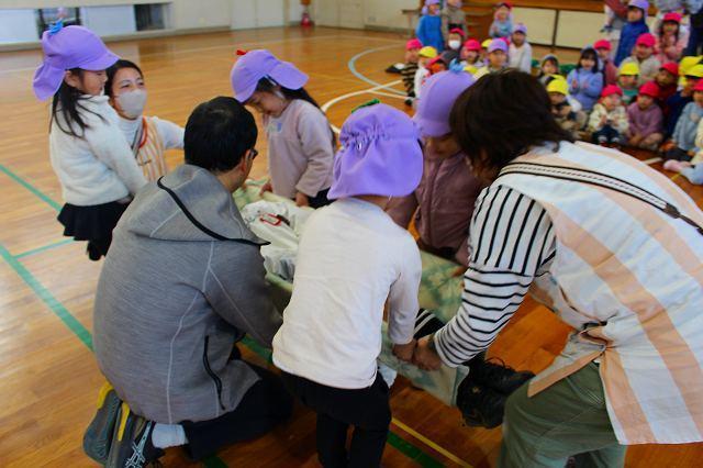 「防災」について考え、取り組んでいる登美丘南小学校の5年生と共に"大きな地震が起きた事”を想定して、合同の訓練を初めて行いました。小学生は園の避難訓練の仕方を見学しながら、子ども達の避難時に手助けできる事を考え行動してくれました。園の子ども達はいつもとは一味違う訓練でしたが、落ち着いて大きなお兄さん、お姉さん方の手を借りて、避難先の小学校体育館へ向かい、無事に到着し、訓練を終えました。