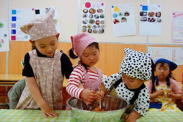 クッキングで〝パンプキンサラダ”を作りました。柔らかくしたかぼちゃを力を合わせてギュッと潰しました。