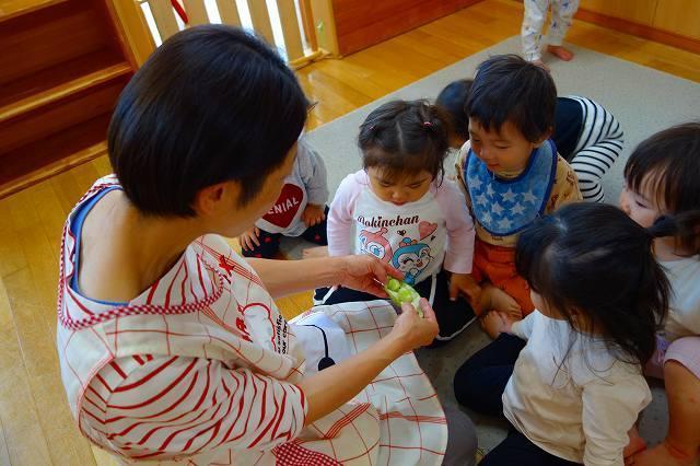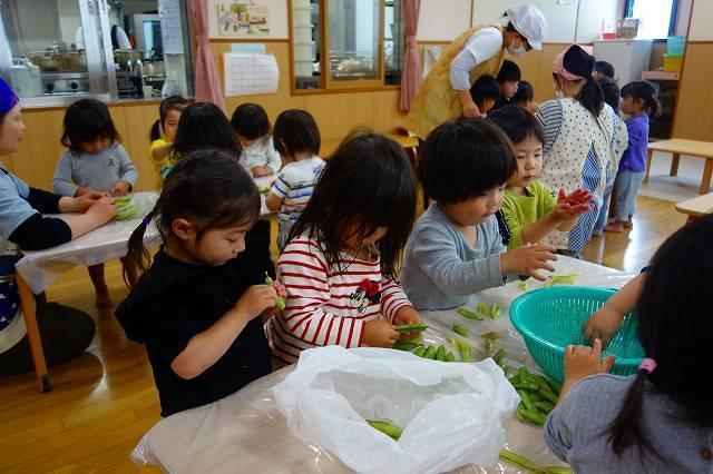 食育指導でそら豆の話を聞きました。フワフワの鞘の中には大きな豆がありました。