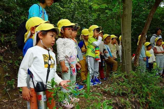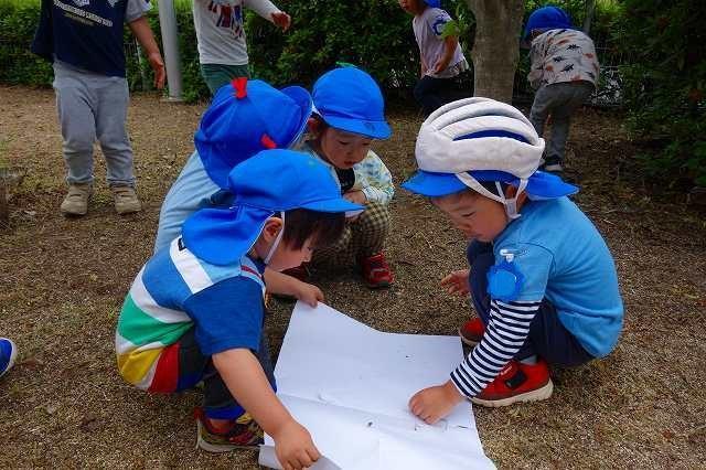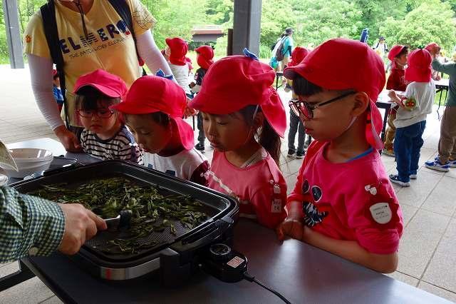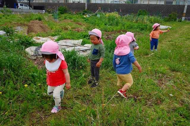 5月15日、丁度よい気候に恵まれ、遠足に出かけることができました。0,1歳児は園の周辺を散歩し近隣の草むらで虫探しや草花に触れました。2歳児は「高松チコリ広場」、3歳児は「つるみち西広場」へ友達と手をつないで歩いて行き、遊具で遊びました。4,5歳児は大型バスに乗って「堺自然ふれあいの森」へ。春の自然を大いに感じながら散策し、5歳児は茶摘み・茶揉み体験をし4歳児と共に作り立てのお茶を味わいました。