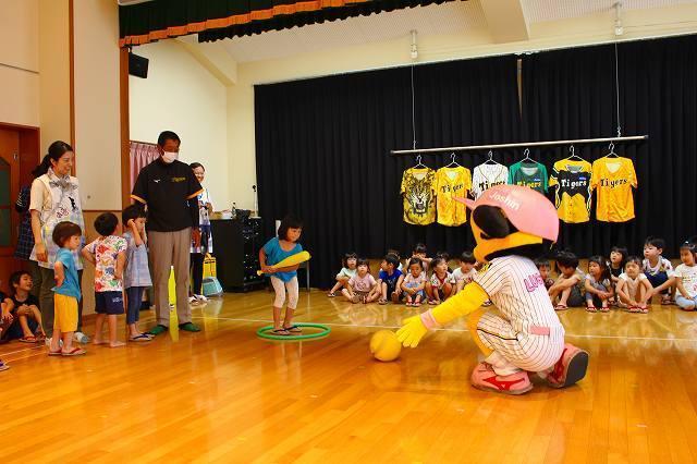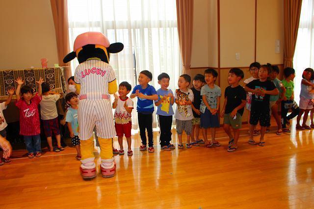 ダンスの後は‟ラッキー”と1対1でのボール遊び!!ファミリーの子ども達は‟ラッキー”が転がしてくれるボールをバットで打ち、1塁に見立てた場所へと走りました。0~2歳クラスの子ども達はその様子を見学。転がってきたボールを拾ってくれるという微笑ましい場面もありましたよ。