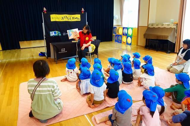 最後には紙芝居を読んでもらいました。拍子木の軽やかな音色と共に紙芝居『いっきんず』がスタート!!登場する魅力的なキャラクターと隊長さんのテンポのいい語り方と展開に引き込まれていましたよ。