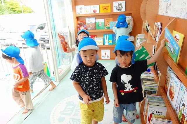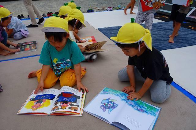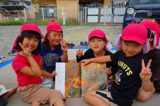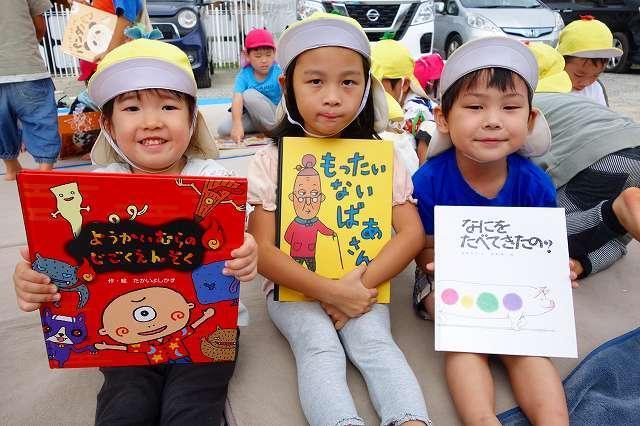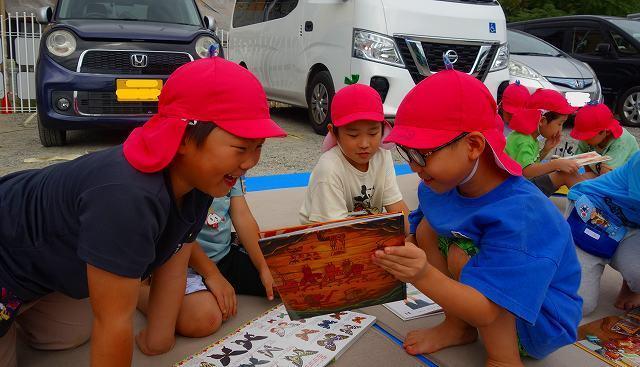 園の駐車場に設置されたキャラバンカーでは好きな絵本を選び、青空の下で友達や先生と楽しみました。