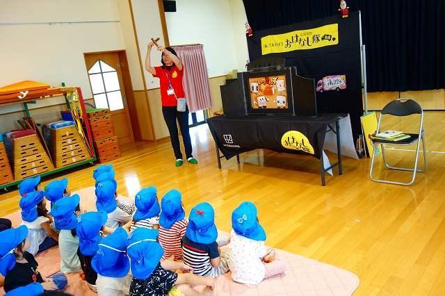 こすもす組とあじさい・ひまわり組の2グループに分かれ、キャラバンカーとおはなし会を順に体験しました。