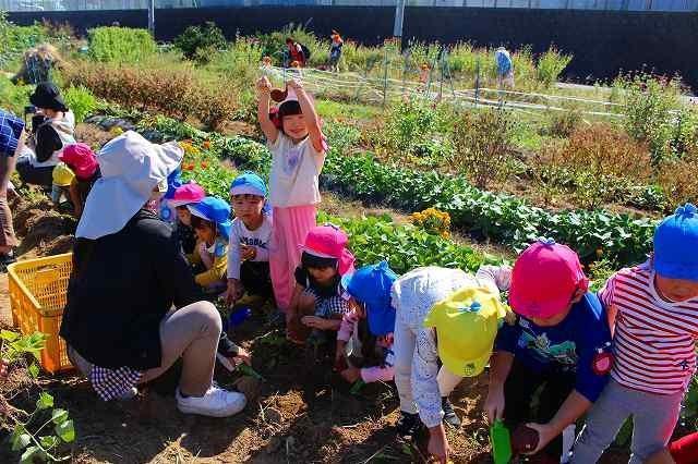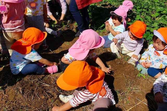秋晴れの一日。毎年、園の子ども達のためにさつまいもを育てて下さっている方の近隣の畑に、全員でいもほりに出かけました。子ども用のスコップを使い、さつまいもに傷をつけないように慎重に、けれど一生懸命力を込めて、土の中から掘り出していましたよ。0,1歳児は土の感触を楽しみながら、掘りたてのさつまいもに触れたり、見つけた虫を観察したり、草遊びを楽しんだりしました。
