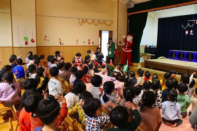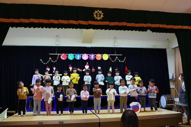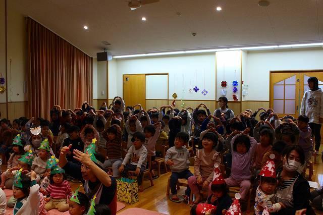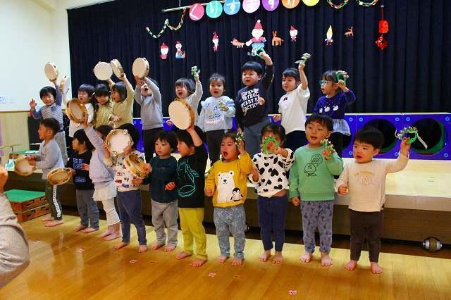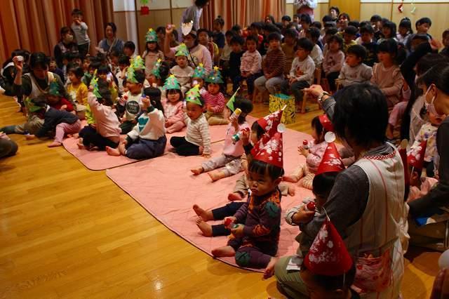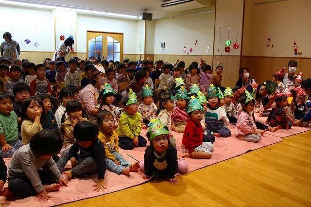 遊戯室でクリスマス会を行いました。キラキラ光るクリスマスツリーを見ながら、子ども達のワクワク気分は高まり笑顔溢れる会になりました。