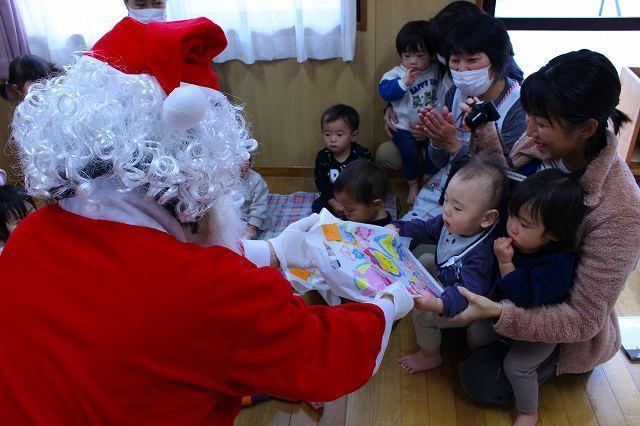 会が終了した後には、各保育室にやってきたサンタさんが、一人一人にクリスマスプレゼントを手渡してくれました。