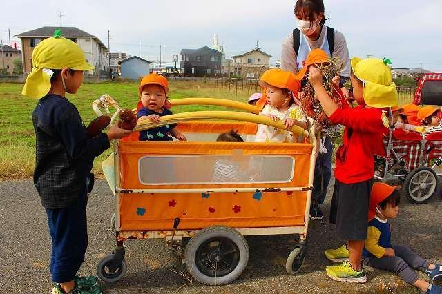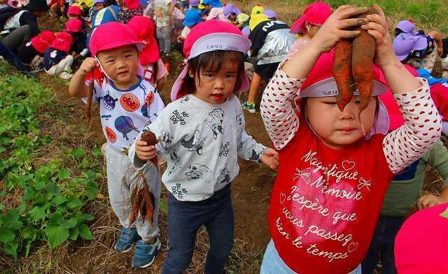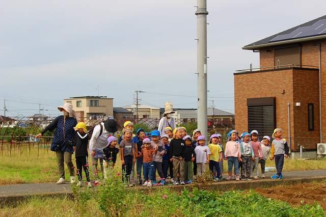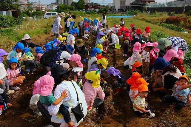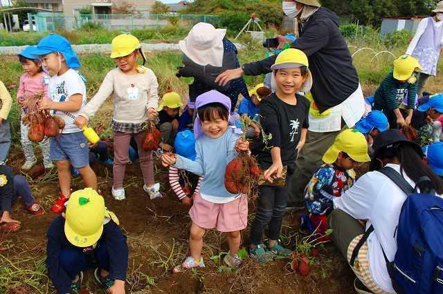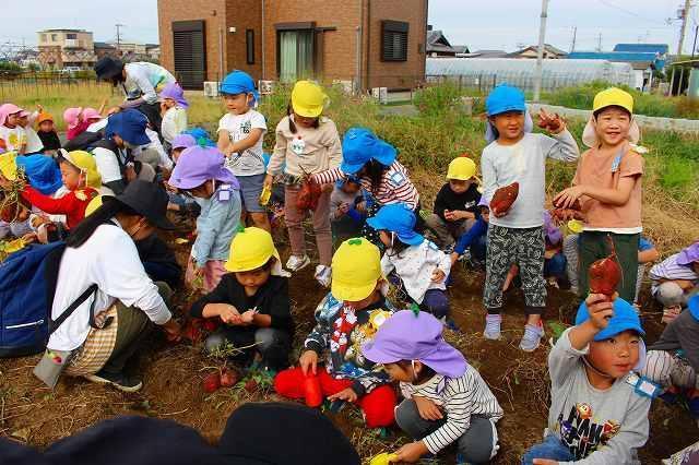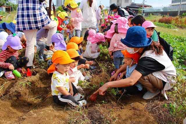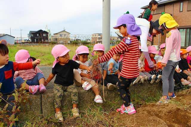 秋の涼しい風が吹く中、芋掘りへ行って来ました。今年も近隣の畑の方が、とみなみこども園の子どもたちのためにサツマイモを育ててくださいました。また、たくさんの葉を付けた長い芋のつるは、先日とみなみ応援団で保護者の方が切ってくださり、準備は万端!農家さんへ元気に挨拶をして芋掘りのスタートです。2~5歳児は、芋を傷つけないように慎重にスコップで掘ったり、力強くつるを引っ張ったり、友達と力を合わせて一生懸命堀り進めていました。