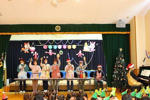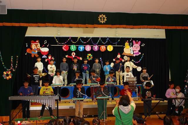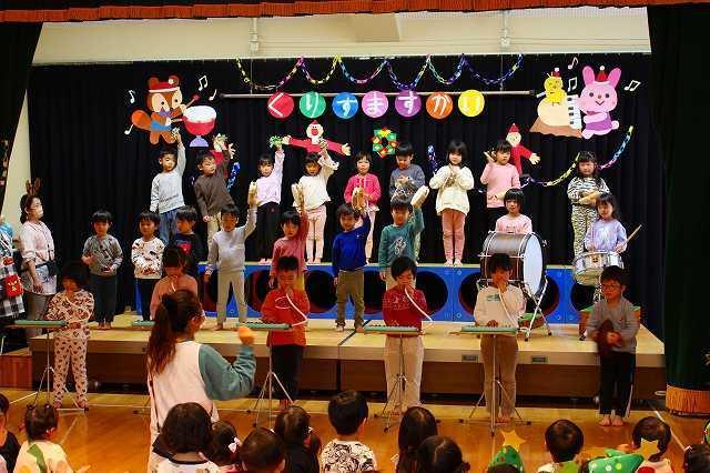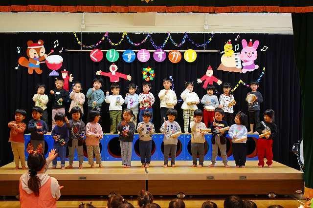 3~5歳児は先日の音楽会で発表した合奏を披露しました。サンタクロースやたくさんのお友達も見る中、ちょっぴり緊張しながらも、堂々とした演奏でした!