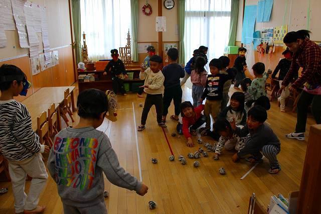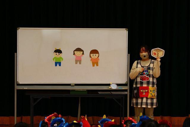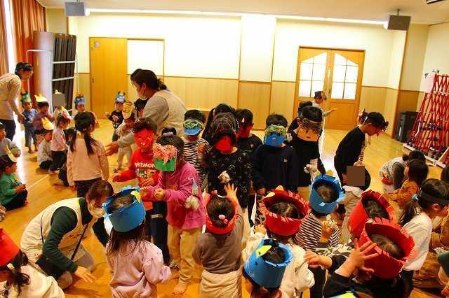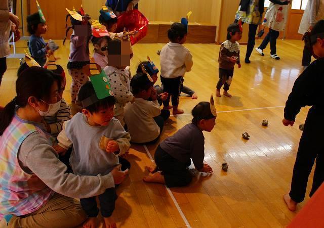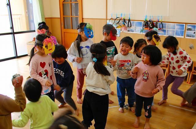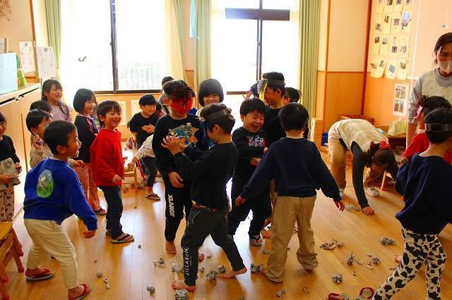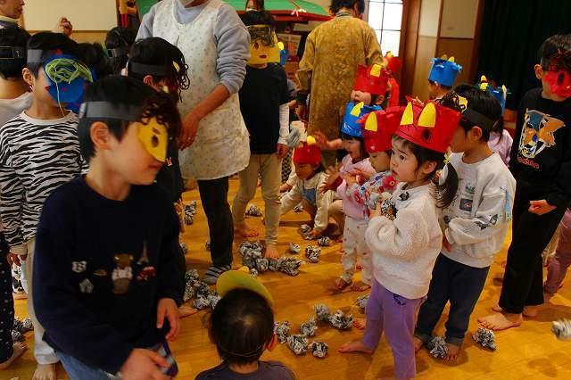 豆まきでは、5歳児が鬼役になりました。0~4歳児は、新聞紙で作った豆を投げました。自分の心の中にいる鬼をやっつけようと意気込み、一生懸命鬼をめがけて「鬼はそと~!福はうち~!」と豆を投げていました。鬼の登場に驚いて泣く姿もありましたが、勇気を出して鬼に近づいていましたよ。みんなの頑張りで、無事に鬼を退治することができました☆