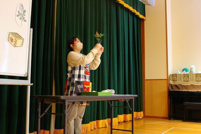 節分の会を行いました。心の中にいる鬼(おこりんぼ鬼・泣き虫鬼・イヤイヤ鬼)をやっつけるために豆まきをしたり、福が舞い込んでくるよう願いを込めて恵方巻を食べたりすることを聞きました。また、鬼が苦手なものといわれているイワシと柊を使った゛やいかがし゛を作るところを実際に見ました。会の後には、豆まきをしたり、イワシを焼いているところを見学したりしましたよ。