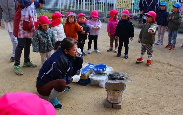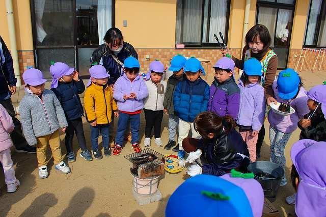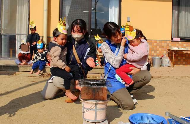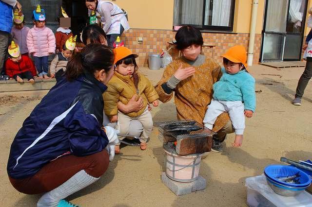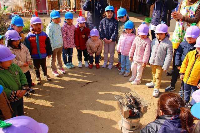 園庭でイワシを焼いているところを見学しました。煙をあげながら焼かれているイワシを夢中になって見ていました。また゛鬼が苦手な匂いってどんな匂いだろう?゛と興味を持って嗅いでいましたよ。「美味しそうな匂い!」「お腹すいてくる~」と話す声が聞こえてきました。