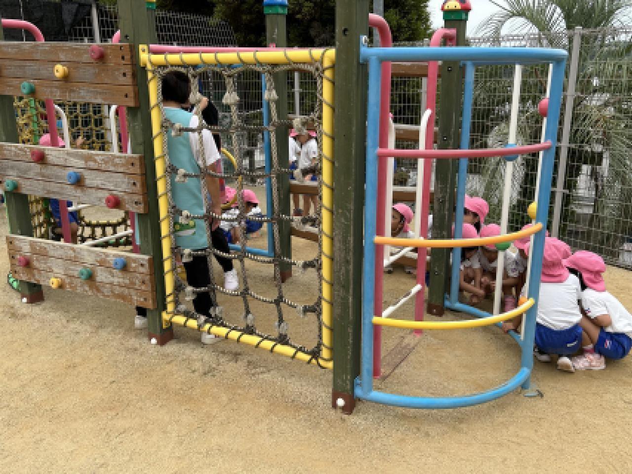 ちょっと見えにくいのですがきりんぐみさん(4歳児)はうんていの練習です