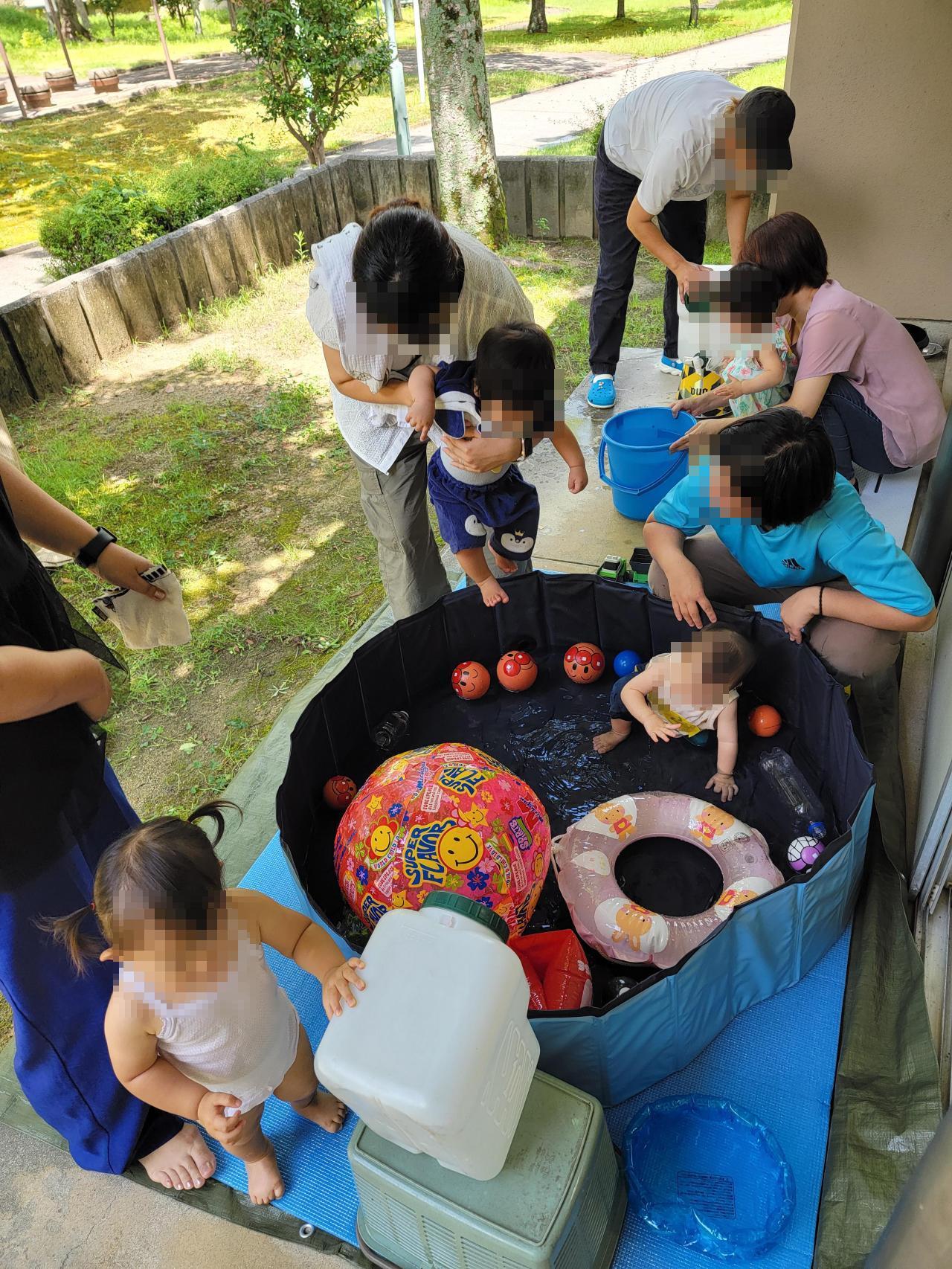 今回は、お外にプールを用意して水遊びを楽しみました。家ではなかなか用意が大変なためできないので、子どもたちは大はしゃぎでした。
