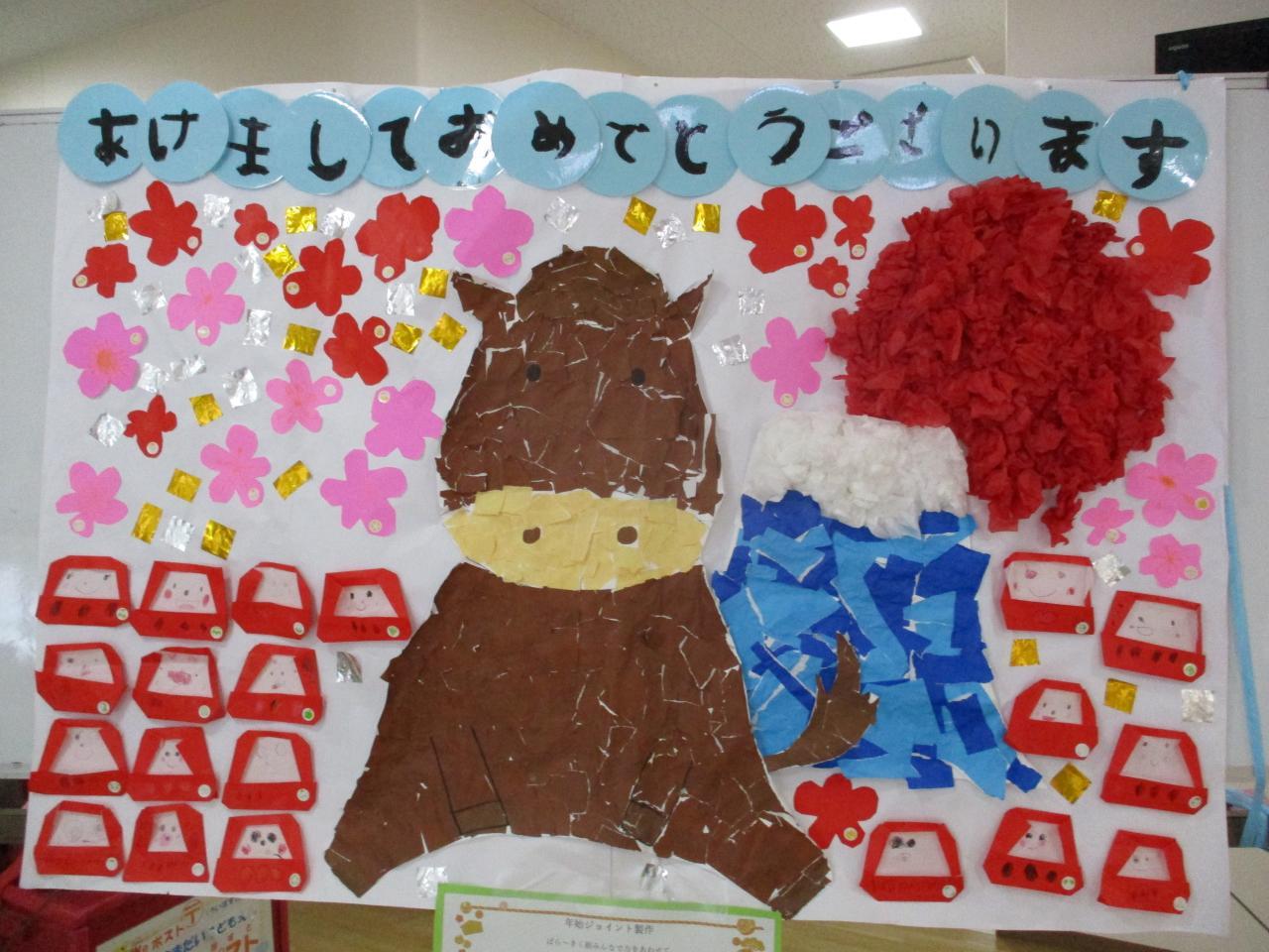 すみれ、あやめ、きく組‥「うま」 大きなうまを三クラスで順番に折り紙を貼って仕上げました。