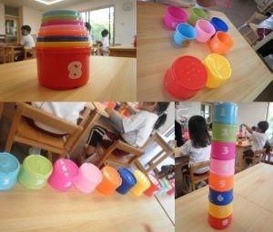 第1回目は自己紹介の後、コップの大きさを比べたり、順番に並べられるか挑戦!