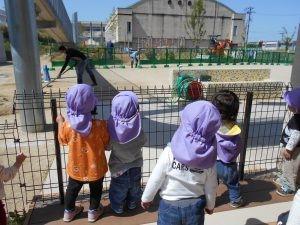5月、園庭に入ってくるトラックやショベルカーに、みんな興味津々!